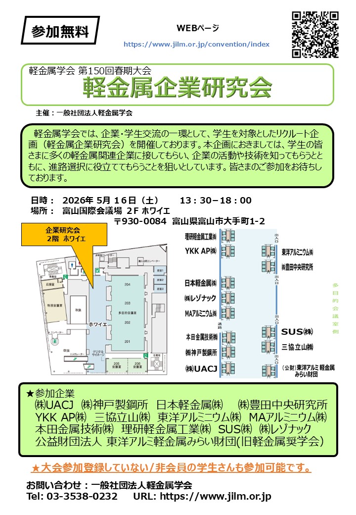 | 第150回春期大会(2026年5月15日~18日 完全対面開催) The 150th Conference of Japan Institute of Light Metals | 2026年5月15日(金)~18日(月) | 富山国際会議場 | 参加申込 Registration |